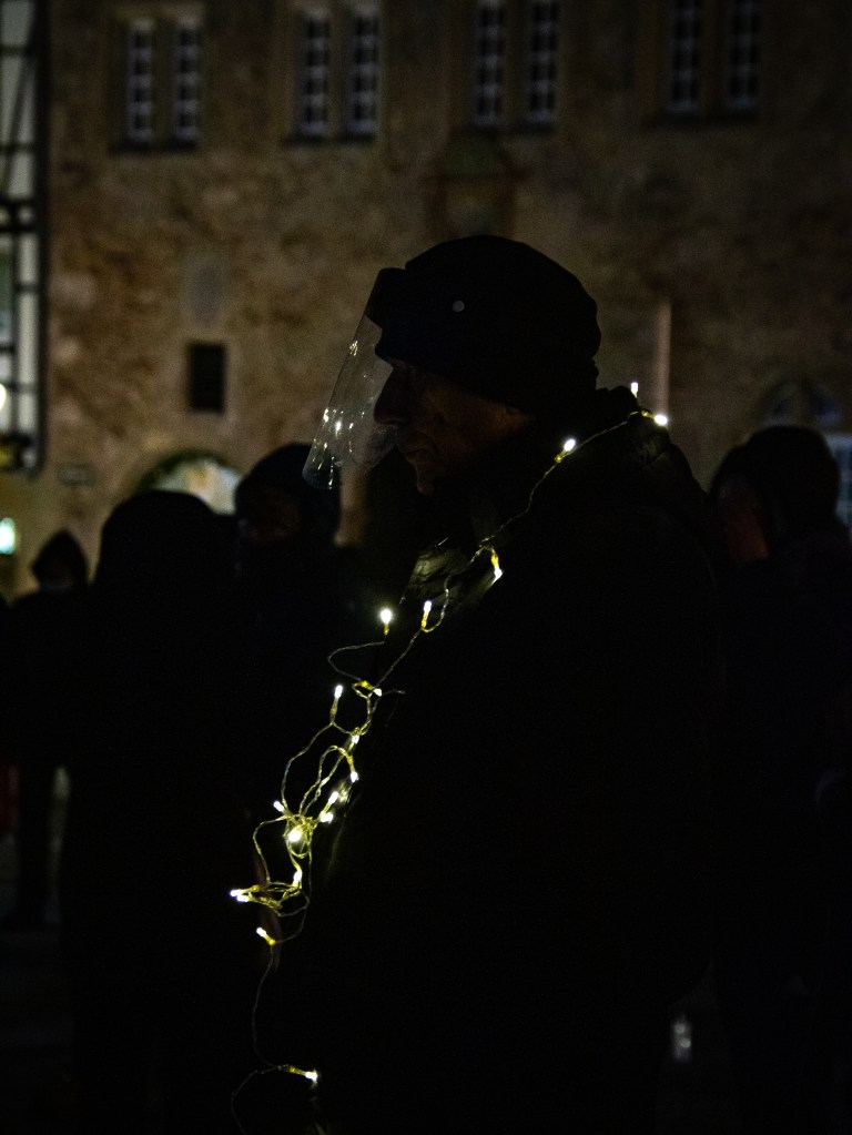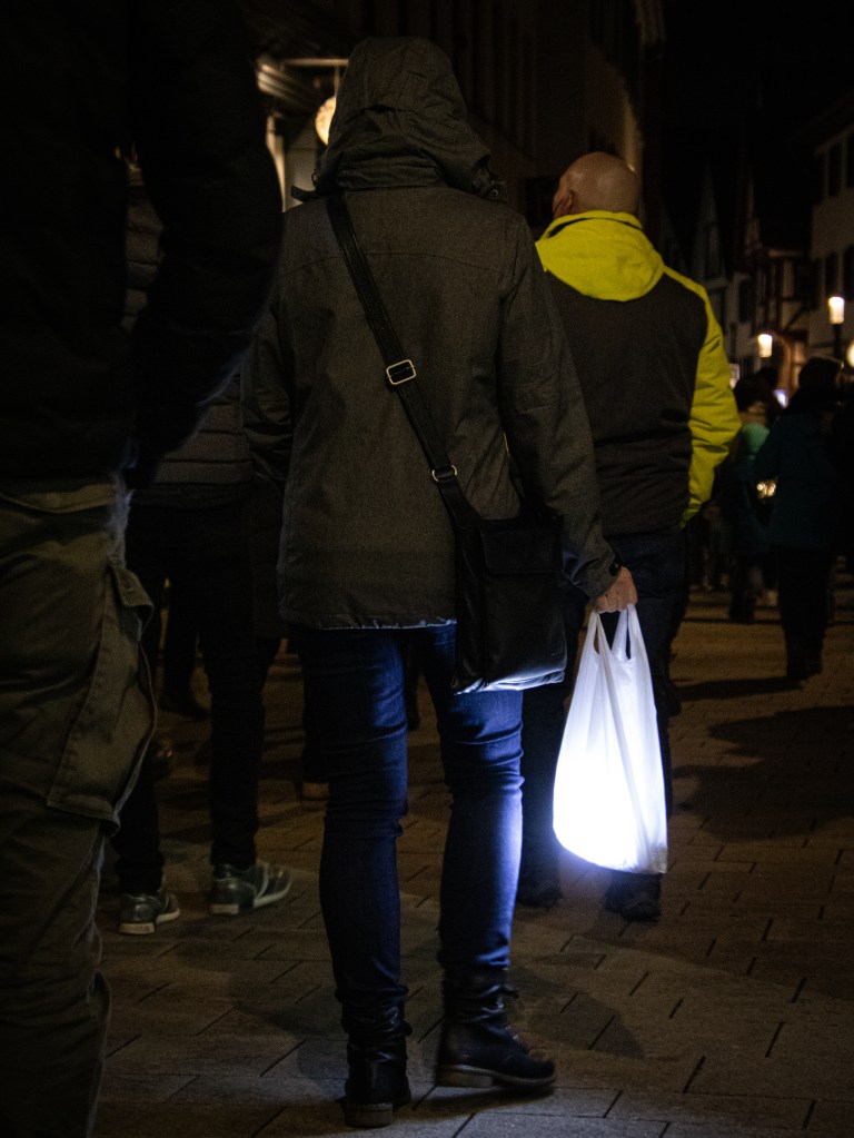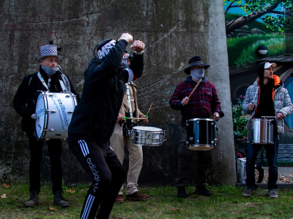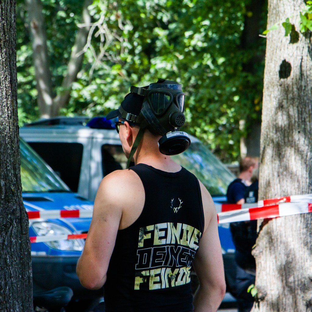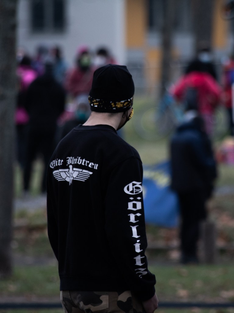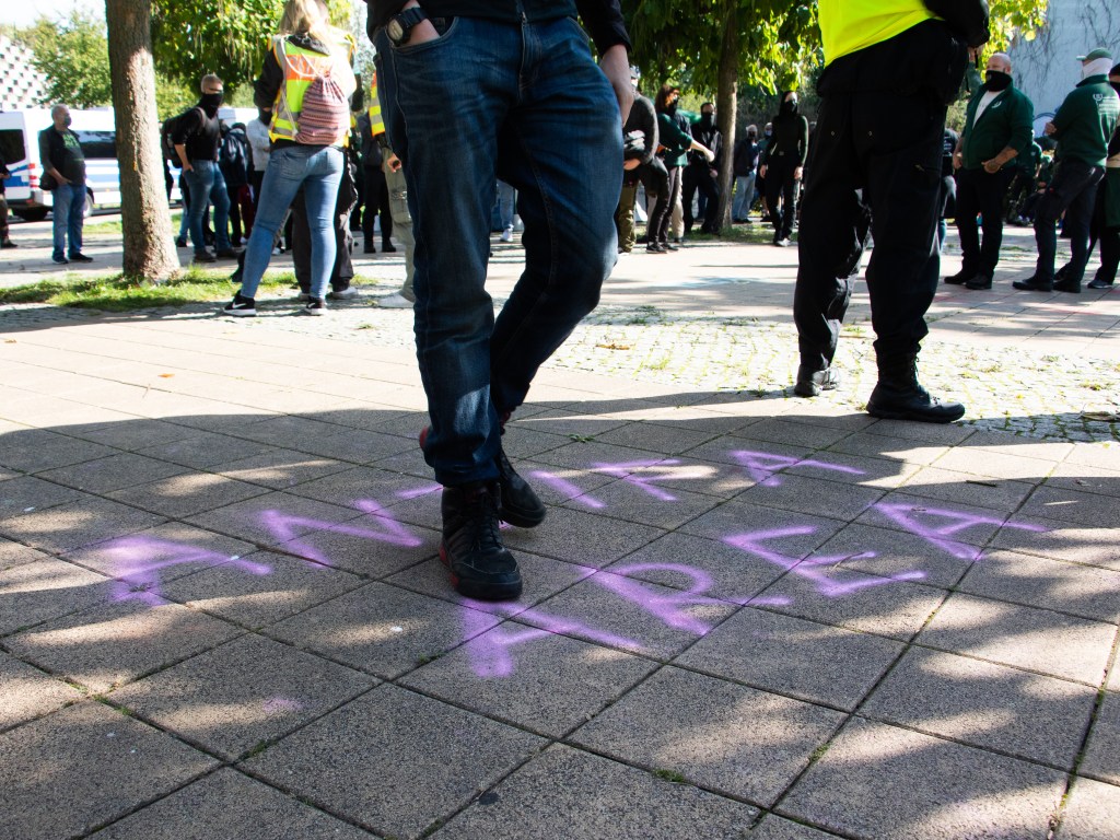 Die Polizei ist mit einer einzelnen Streife vertreten. Mit der Gruppierung habe es nie Probleme gegeben, erzählt man mir. Das Einhalten des Sicherheitsabstandes und das Tragen des Mund-Nasen-Schutzes sei Auflage der Stadt gewesen. Zumindest ersteres wird eingehalten. Die Gesichtsbedeckung fehlt allerdings bei einer Vielzahl von Teilnehmerinnen und Teilnehmern.