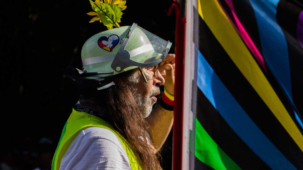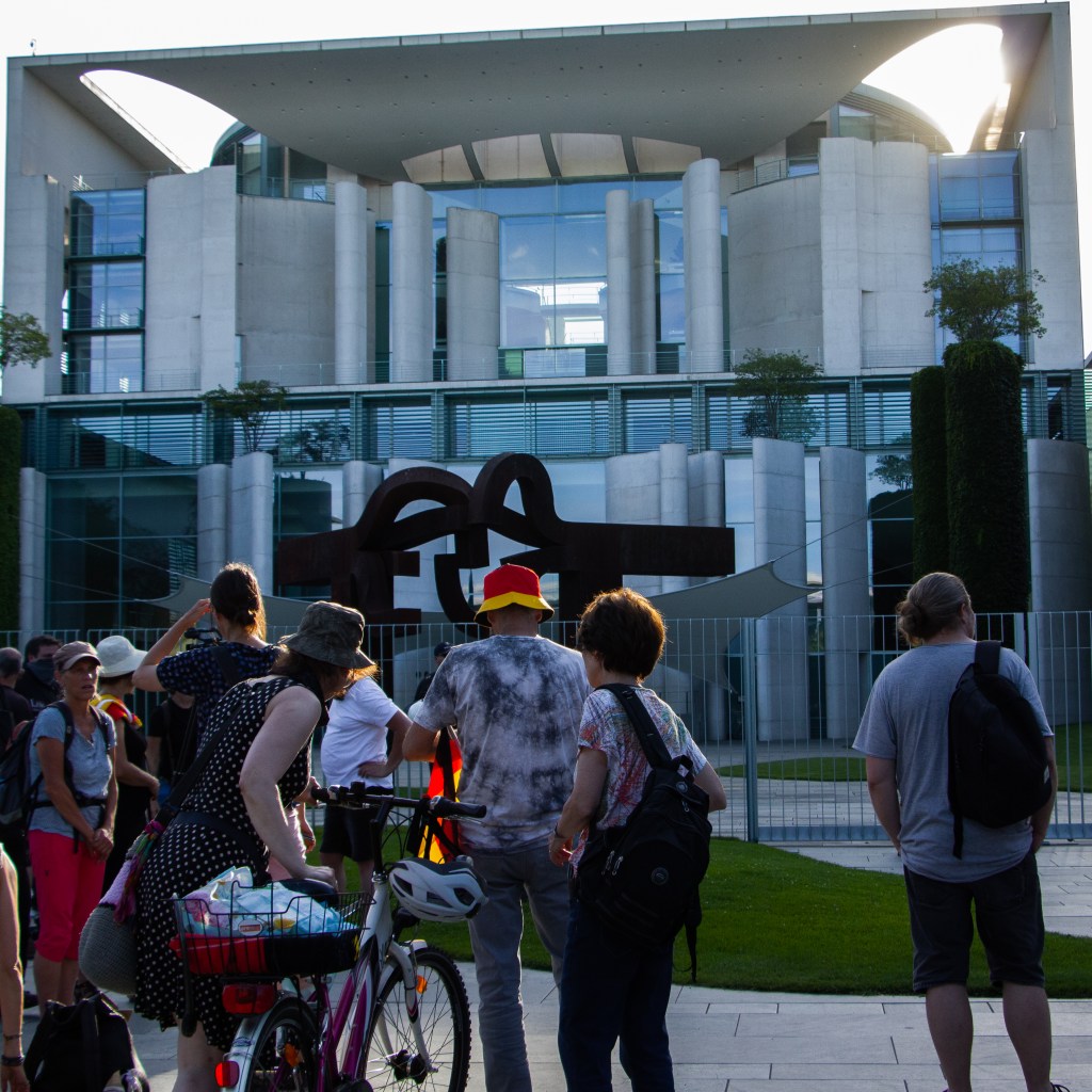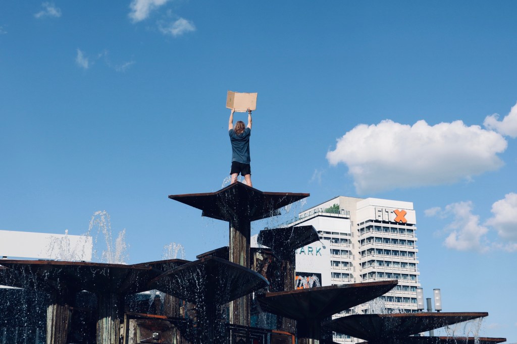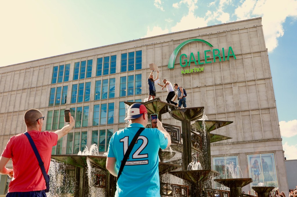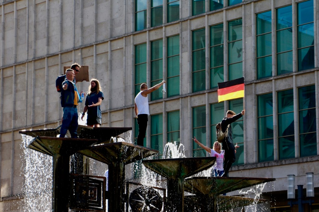 So kommt es auch zu dieser skurrilen Szene. Die ersten auf dem Brunnen wettern gegen Gates und fordern mehr „Liebe für die Menschheitsfamilie“. Kurz darauf folgen ein paar junge Männer und schwenken eine Deutschlandfahne.