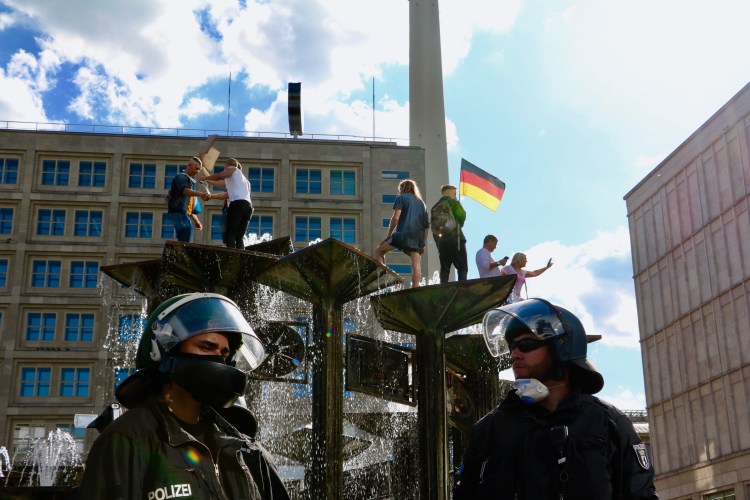 Die #Hygienedemo heute am #Alexanderplatz war eine der eigenartigsten Demos, die ich je gesehen hab. Hippies baden mit Rechtsradikalen und halten Deutschlang Flaggen hoch. Die Menge johlt.