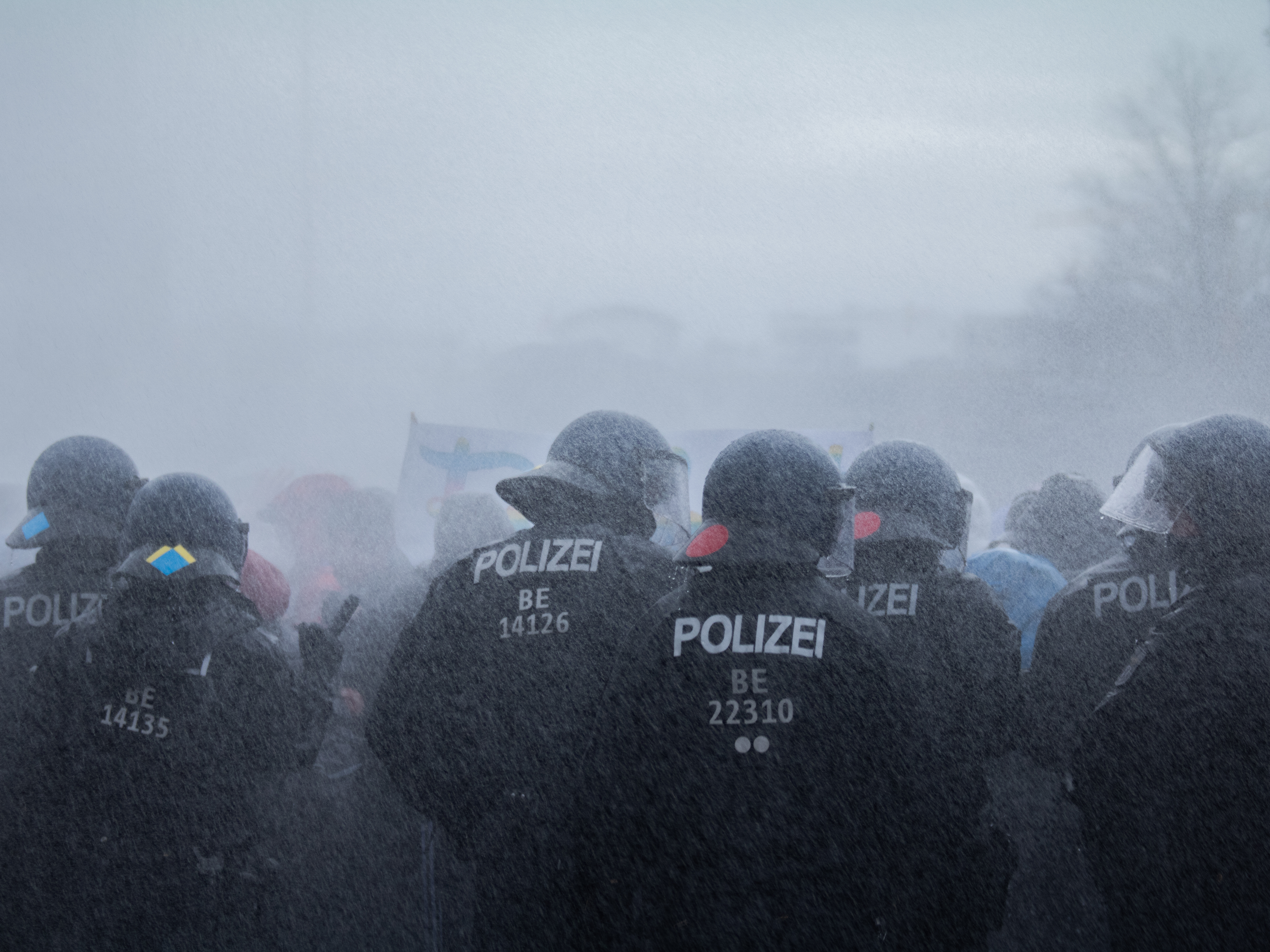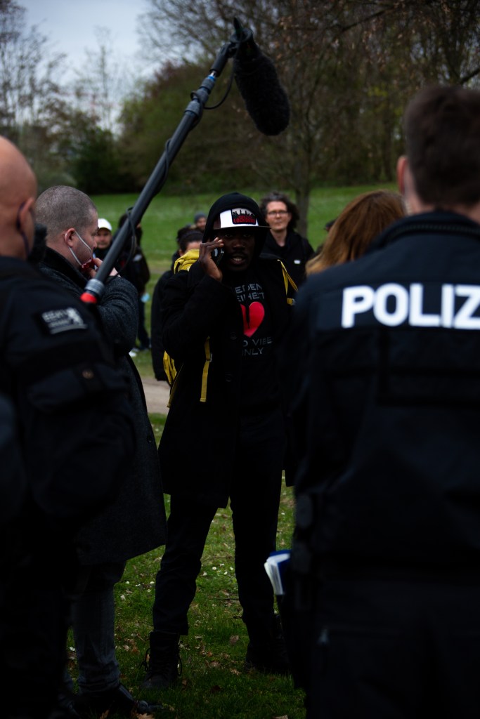 Als der Druck auf eine der Eingänge größer wird, droht die Polizei mit Maßnahmen – um fünf Minuten später die Ansage zu torpedieren und die etwa 200 Personen auf die Demonstrationsfläche zu lassen.