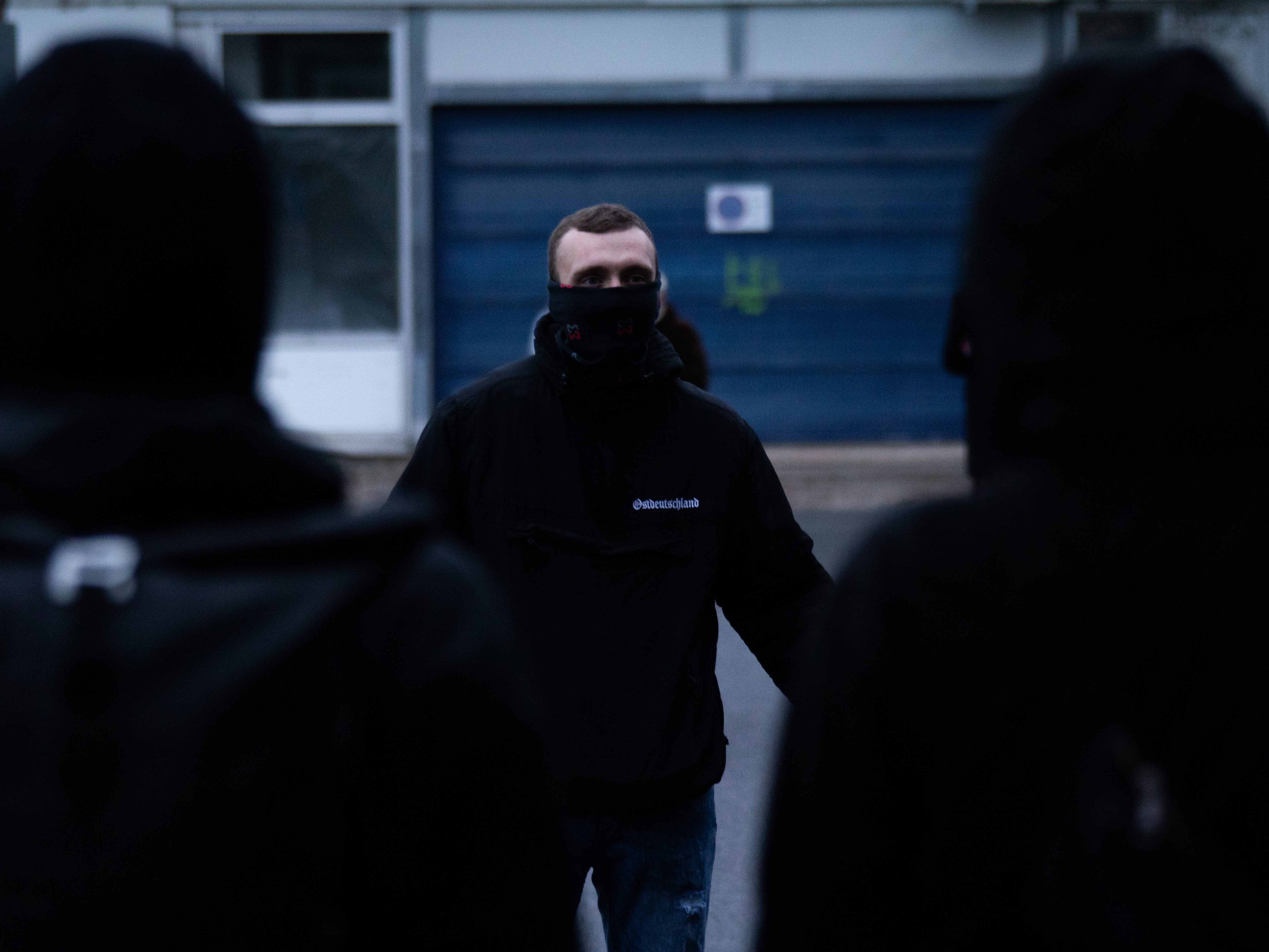 …aber auch viele Rechtsextreme und Hooligans treten offen auf – gut daran zu erkennen, dass sie sich mit als einzige auf der Demo, neben den Pressevertretern, maskieren.