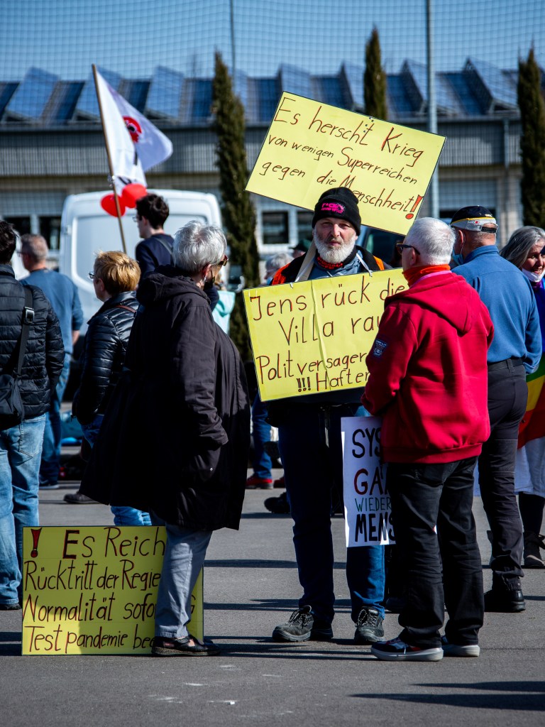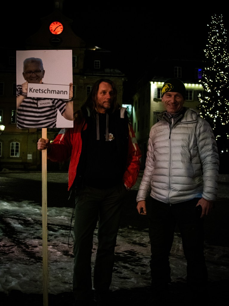 Neben Kretschmann, Drosten und Lauterbach werden auch anderweitig politikverächtliche Aussagen getätigt – das im Bild zu sehende Konterfei des Ministerpräsidenten wird zum Ende der Kundgebung von einigen Teilnehmenden gemeinschaftlich geboxt.