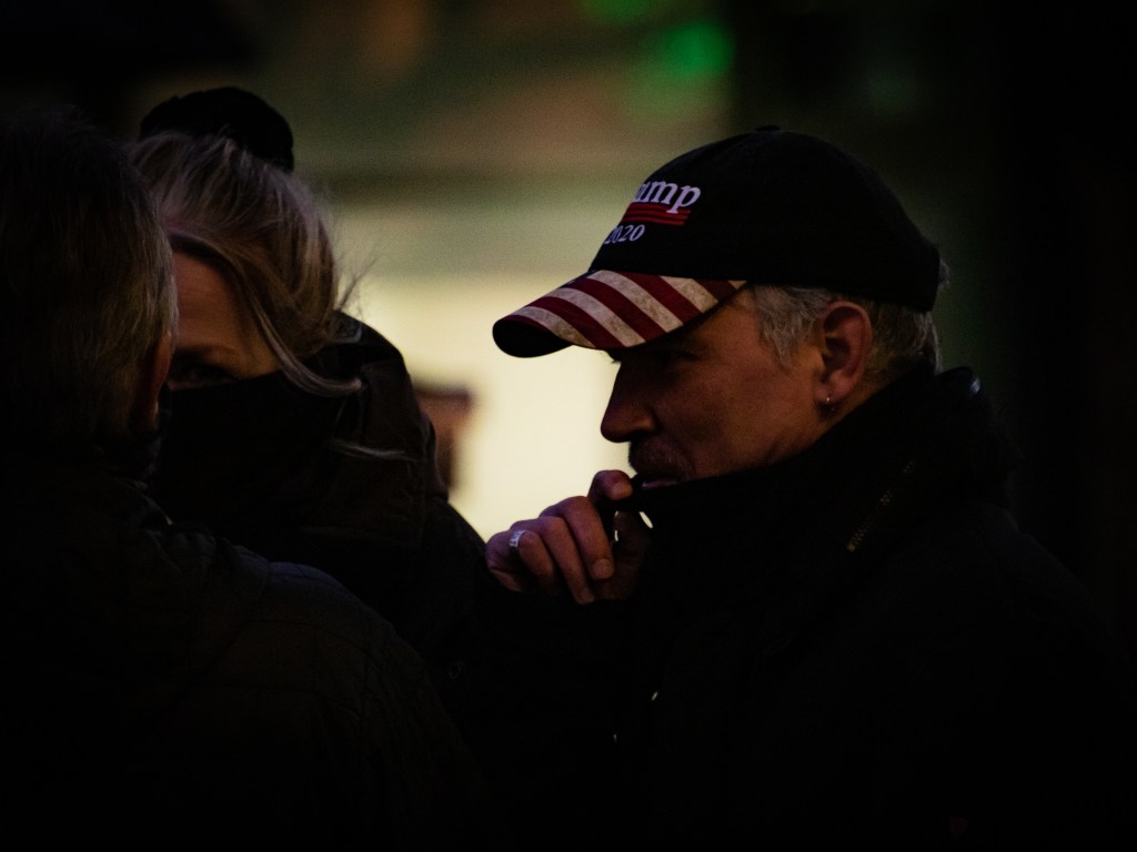 Nachdem ich dieses Foto schieße, schickt mich die Versammlungsanmelderin zur Polizei, um mich auszuweisen. Die reagiert gelassen, Bitten des Mannes, dass meine Fotos gelöscht werden sollten, lehnt sie ab. Als ich die Versammlungsleiterin frage, wieso sie nicht möchte, dass solche Kappis nicht auf ihrer Demo getragen werden, entgegnet sie, jeder dürfe tragen was er möchte. Auch wenn sie kein Fan von Trump sei, er sei nun mal demokratisch gewählter Präsident gewesen.