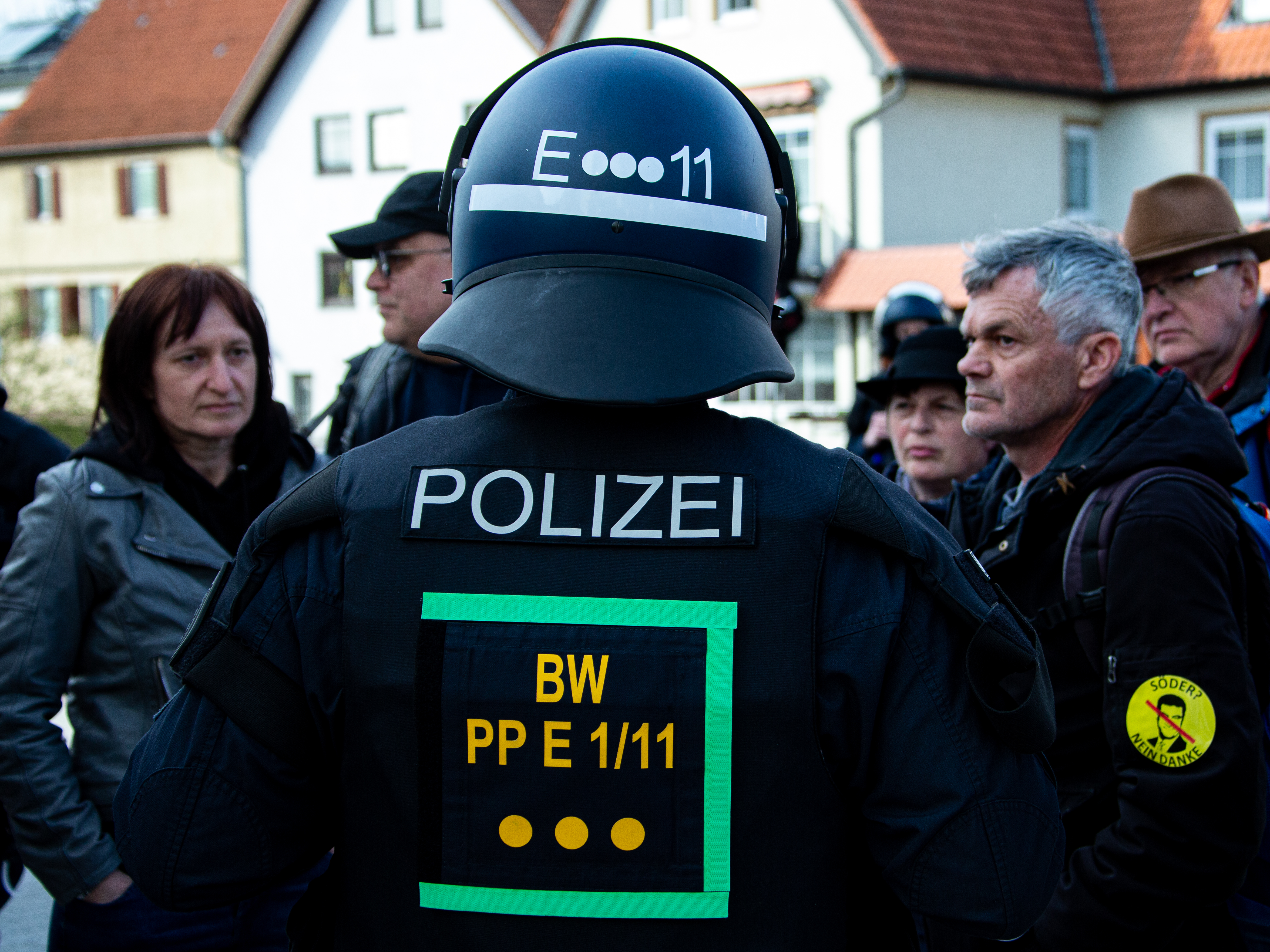 Im Verlauf des Nachmittags ziehen immer wieder Kleingruppen von Querdenkern durch die Sinsheimer Innenstadt und blockieren für einige Zeit den Zugverkehr. Die Polizei hat die Situation nicht mehr unter Kontrolle. Lediglich der kleine antifaschistische Gegenprotest wird festgesetzt.