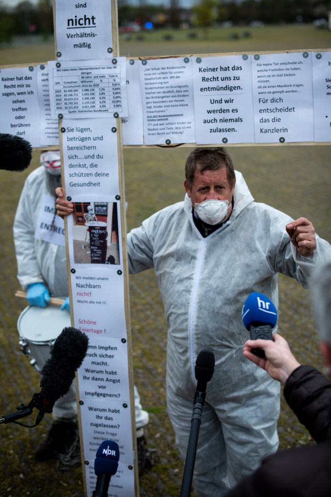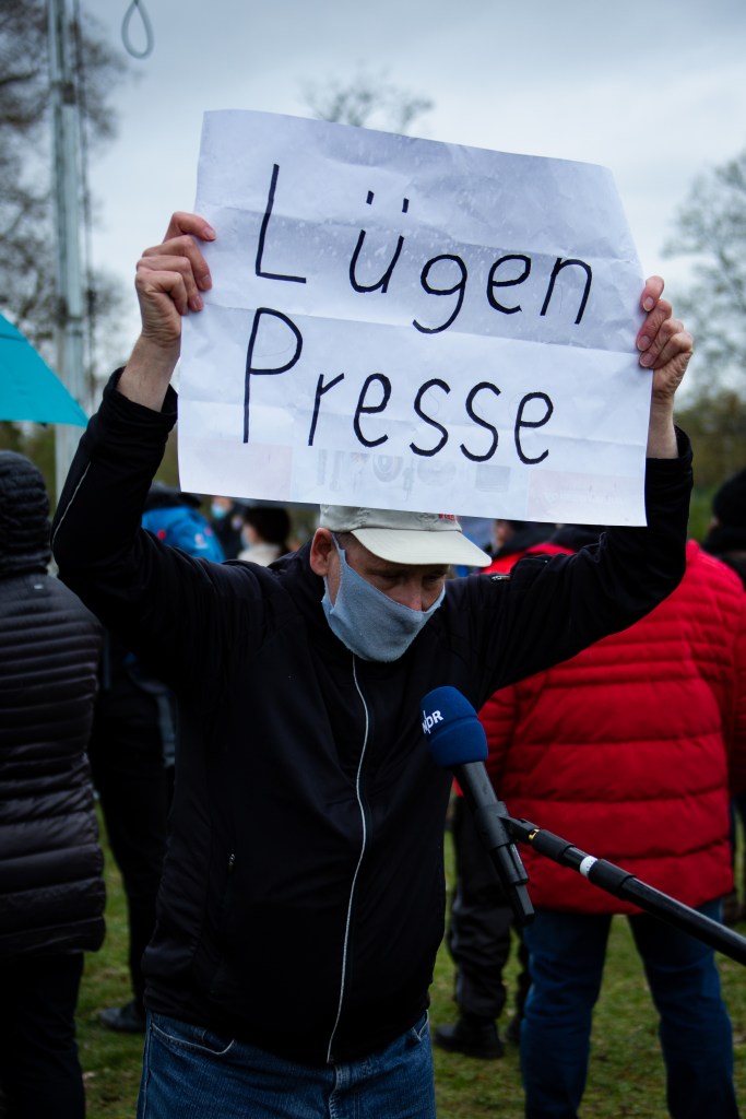 Am Sonntagabend bemüht sich Nils Altland im Rebstockpark Ruhe zu bewahren. Der Reporter des NDR versucht, ein Schlussstatement aufzunehmen, wird aber von einigen Umstehenden permanent unterbrochen und in sinnentleerte Debatten verstrickt. »Ihr lügt euch doch eh was zusammen«, brüllt ihm ein junger Mann zu. Altland bricht ab, bittet darum, einfach nur seinen Job machen zu dürfen. »Such dir einen anderen Job«, ruft eine ältere Frau. Die Umstehenden lachen hämisch. Die Menschen benehmen sich wie im Zenit einer späten Pubertät.