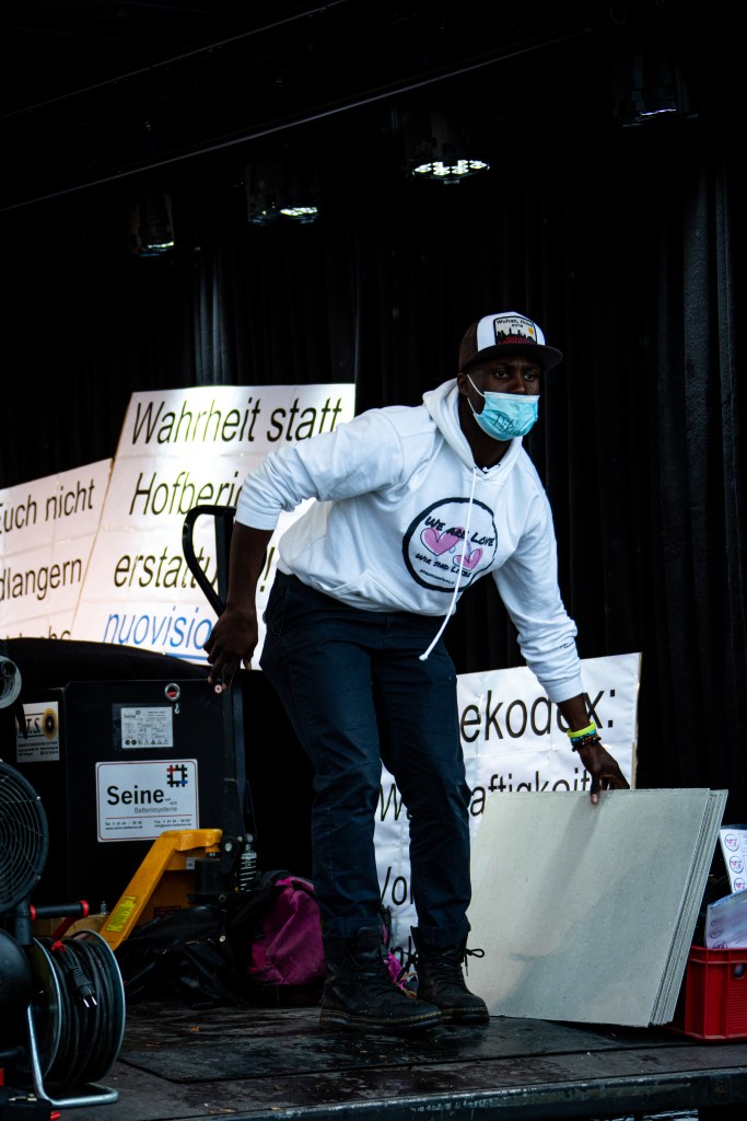 Die Veranstalter, darunter „Querdenken“ Größen wie Nana Domena, Eva Rosen oder Anselm Lenz lassen ein Feuerwerk an Sprechblasen ab. Es geht gegen die Impfung, die Corona-Maßnahmen, die Medien – aber immer für die Liebe. Minutenlang läuft ein Film voller austauschbarer Statements, die den hier unter der Oberfläche wabernden Faschismus überdecken und Initiator Domena zu Tränen rührt.